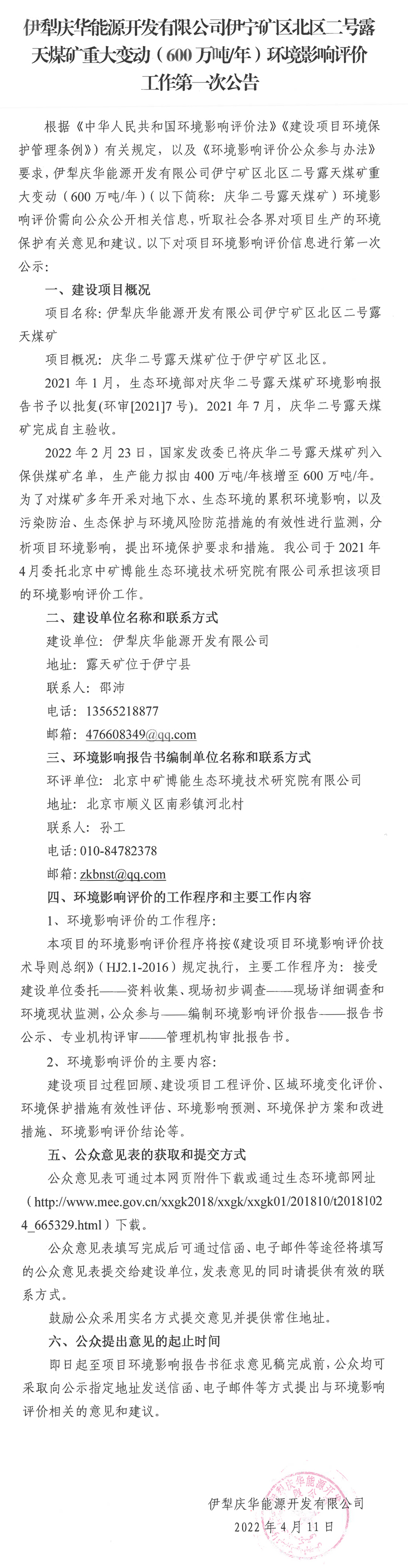 伊犁慶華能源開發有限公司伊寧礦區北區二號露天煤礦重大變動(600萬噸/年)環境影響評價工作第一次公告