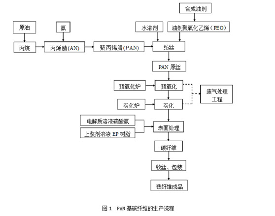 PAN基碳纖維的炭化收率比粘膠纖維高,可達45%以上,而且因為生產流程,溶劑回收,三廢處理等方面都比粘膠纖維簡單,成本低,原料來源豐富,加上聚丙烯腈基碳纖維的力學性能,尤其是抗拉強度,抗拉模量等為三種碳纖維之首。所以是目前應用領域最廣,產量也最大的一種碳纖維。PAN基碳纖維生產的流程圖如圖1所示。