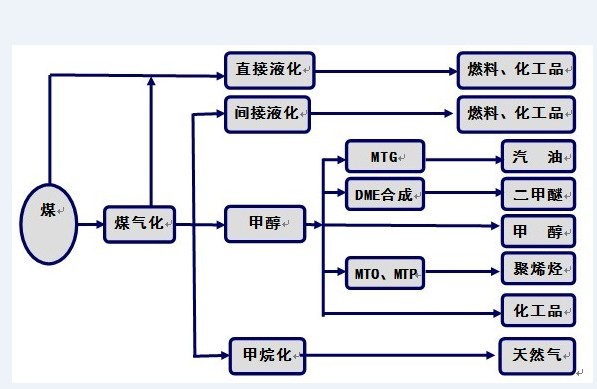 現(xiàn)代新型煤制油化工技術(shù)是以煤炭為基本原料,經(jīng)過氣化、合成、液化、熱解等煤炭利用的技術(shù)途徑,生產(chǎn)潔凈能源和大宗化工產(chǎn)品,如合成氣、天然氣、柴油、汽油、航空煤油、液化石油氣、聚乙烯、聚丙烯、甲醇、二甲醚等。改變傳統(tǒng)的煤炭燃燒、電石、煉焦等以高污染、低效率為特點(diǎn)的傳統(tǒng)利用方式。